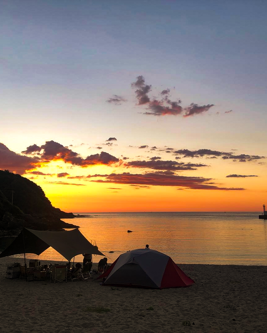 兵庫県豊岡市・竹野の「目の前が、海」のキャンプ場、「弁天浜キャンプ場」です。